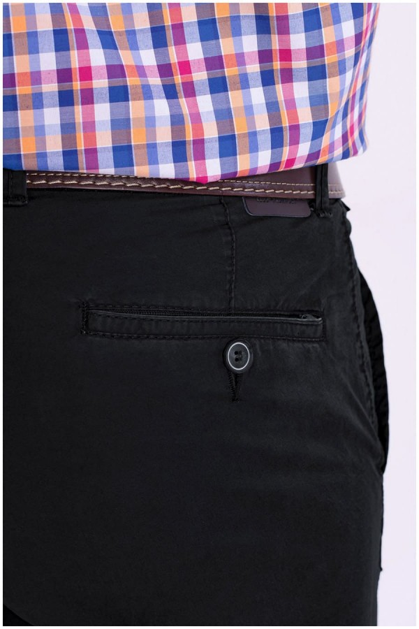 Deze elastische COLD-BLACK CHINO van Club of Comfort warmt niet op in de zon en beschermt bovendien tegen UV stralen! Eindelijk kunt u dus ook op warme dagen lekker zwart dragen! Deze twill-stof is gemaakt van een nieuwe soort katoen, met extra stretch, een hoog comfort en duurzaamheid. In het rechter zakje bevindt zich nog een geheim extra zakje met een rits.