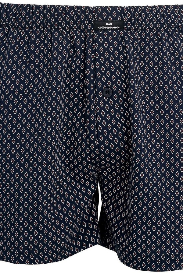 100% katoenen bedrukte boxershort van Götzburg. Deze boxer heeft een gulp met een tonaal knoopje. De boxershort is gemaakt van "KLIMA-ACTIV" stof, dat wil zeggen een mix van katoen en microvezels die garant staat voor een betere afvoer van lichaamswarmte. Tevens is het gemakkelijk te onderhouden levert het een beter behoud van kleuren. De stof heeft een "peach finish" (perzikhuid) waarmee maximale gladheid en draagcomfort wordt bereikt.