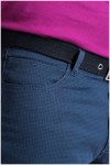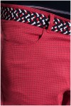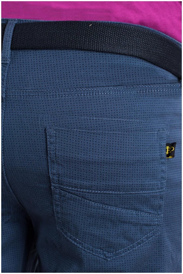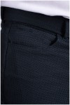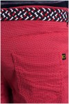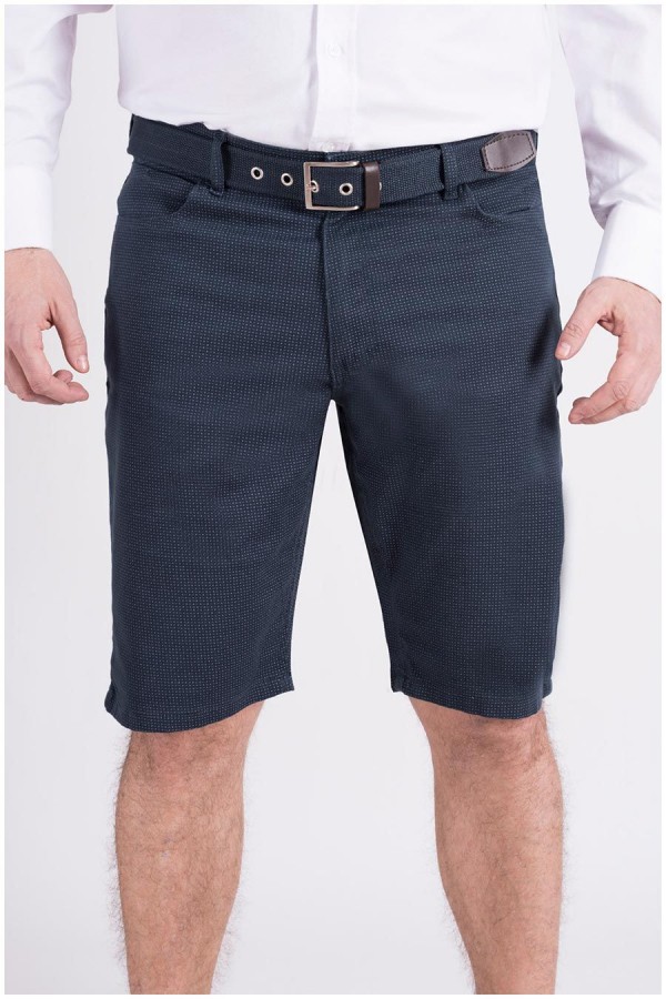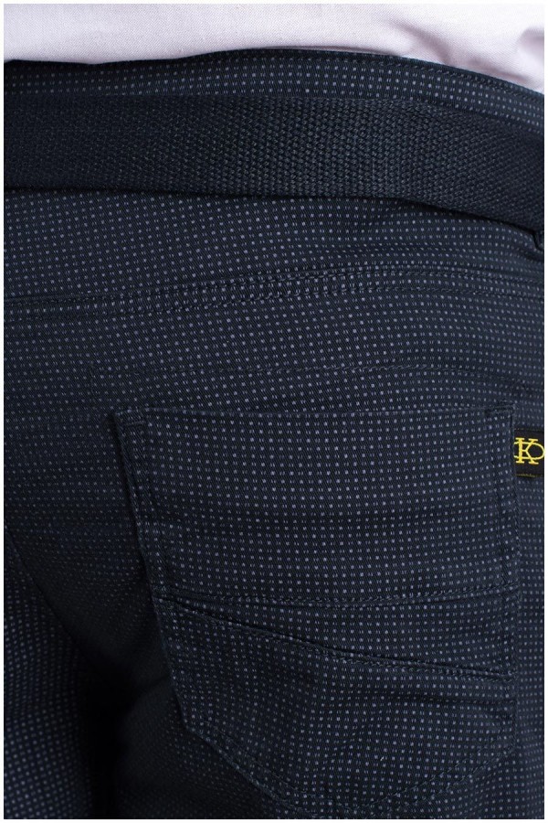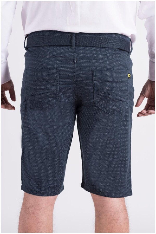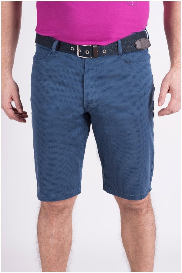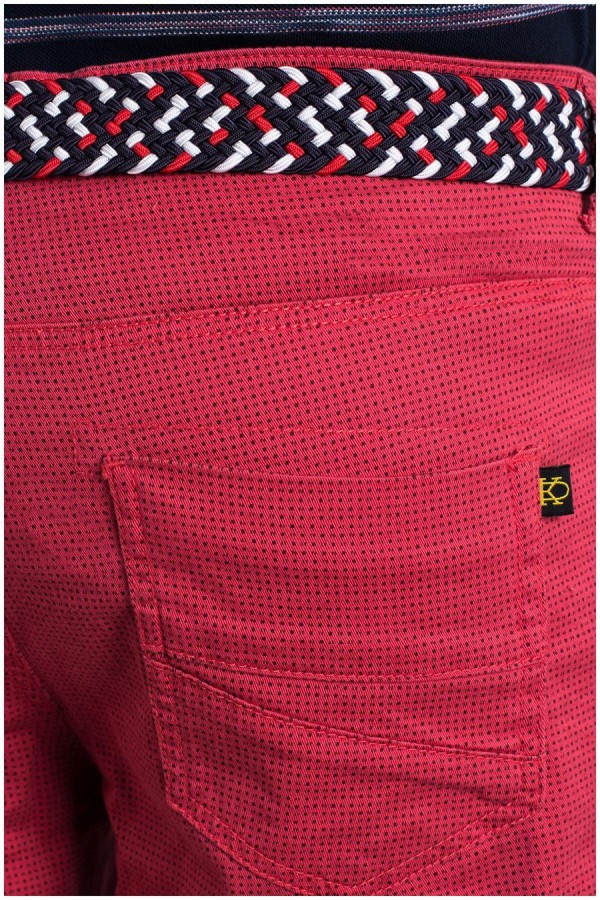 Katoenen elastische short van het merk Koyote. De stof, met stretch eigenschappen, heeft een allover print van kleine stippeltjes, die de broek een zeer modieuze look geven. Dit 5-pocket model heeft grote achterzakken en aan de rechterkant nog een klein zakje in de zijzak verwerkt.