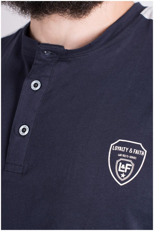 Lounge t-shirt van het merk Loyalty & Faith gemaakt van elastische sweatkwaliteit. Het schouderstuk en de mouwen zijn in een contrastkleur gemaakt. Met serafino kraag met knoopjes. Het Loyalty & Faith logo is op de linkerborst gedrukt. Heerlijk voor in huis!