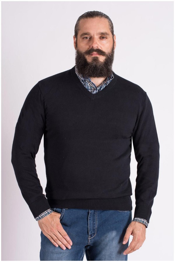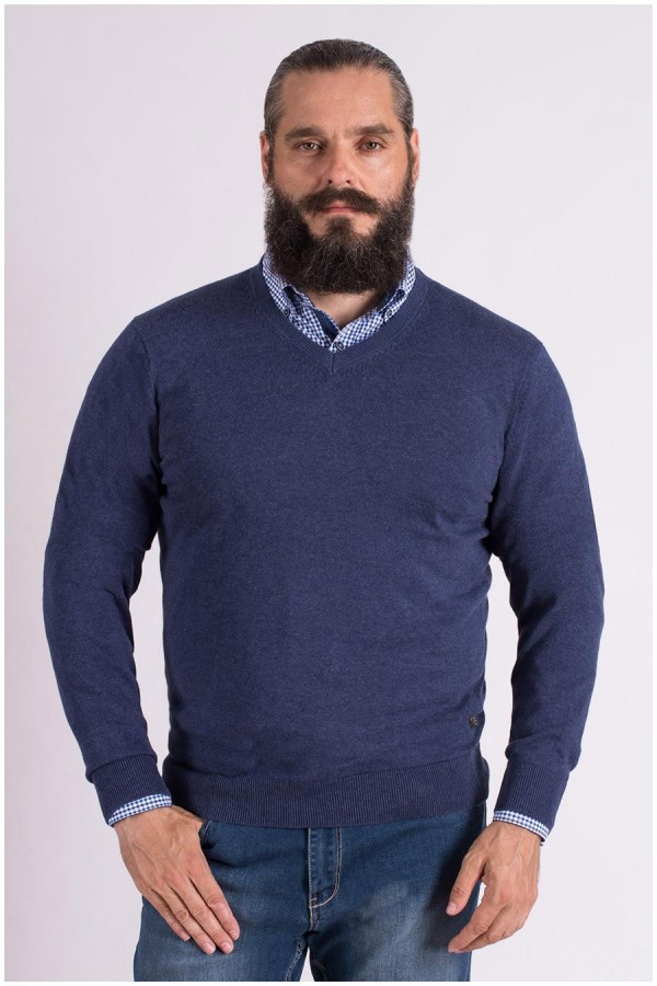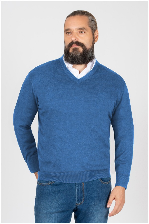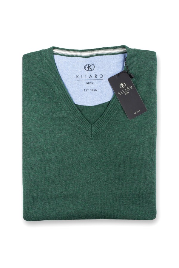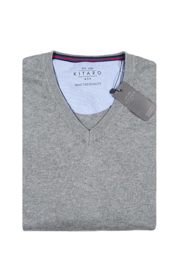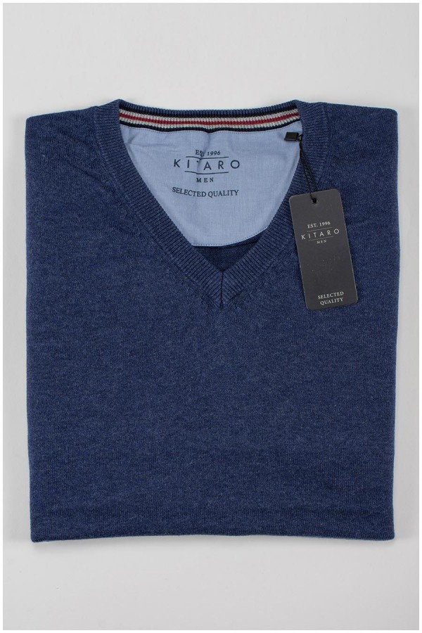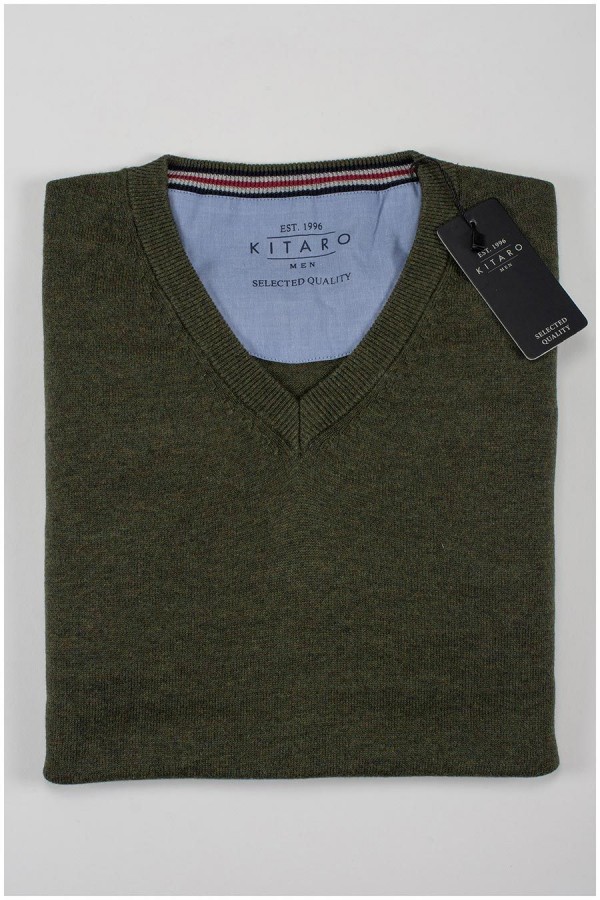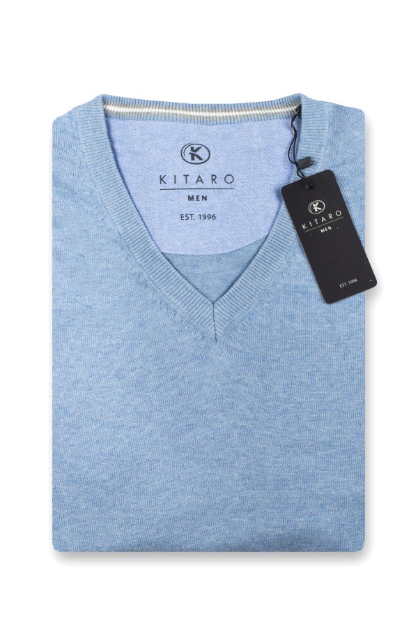 Unikleurige trui met V-hals van het merk Kitaro (art.nr. 69347). De grote maten trui is gemaakt van 100% katoen. Met contraststof met Kitaro-print erop in de kraag. Dit artikel is ook beschikbaar inÂ