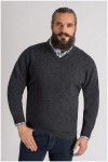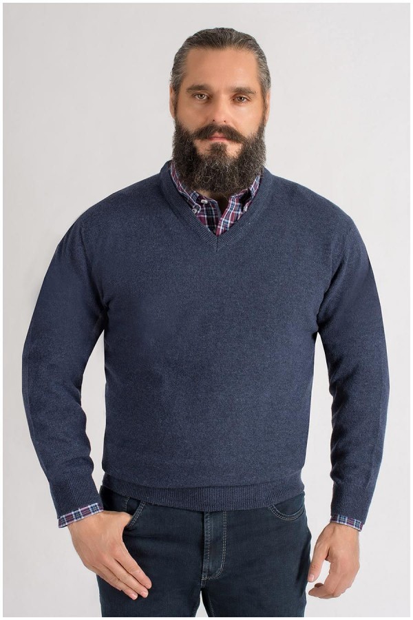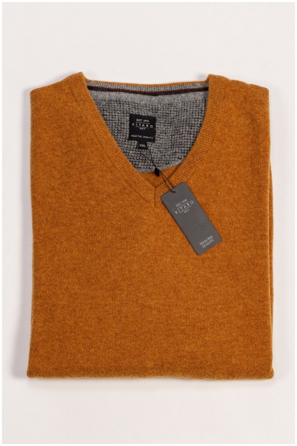 Extra lange unikleurige V-hals trui van het merk Kitaro, gemaakt van zachte lamswol.