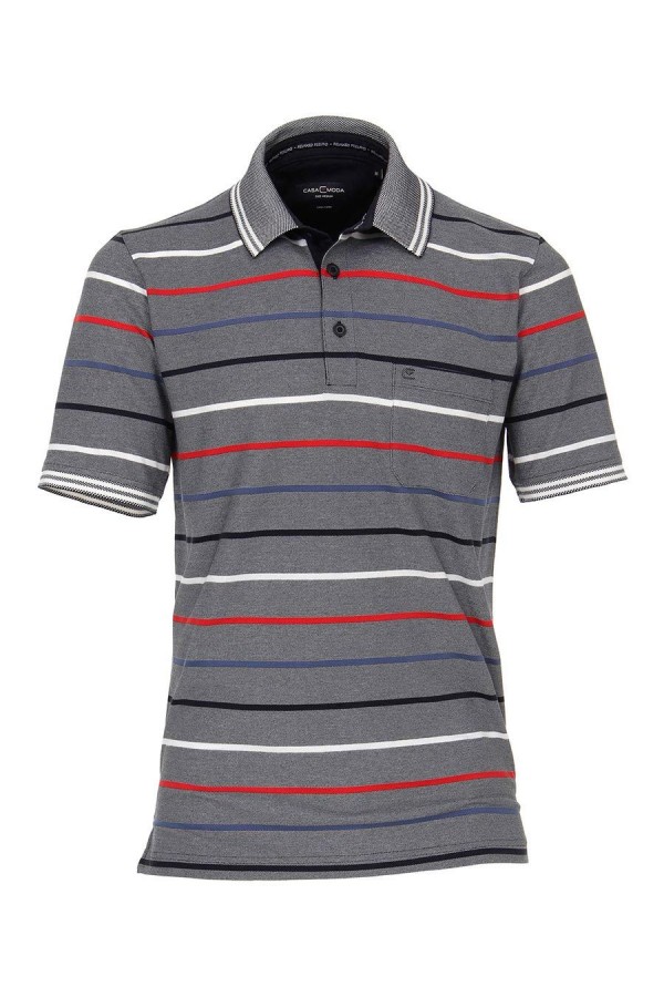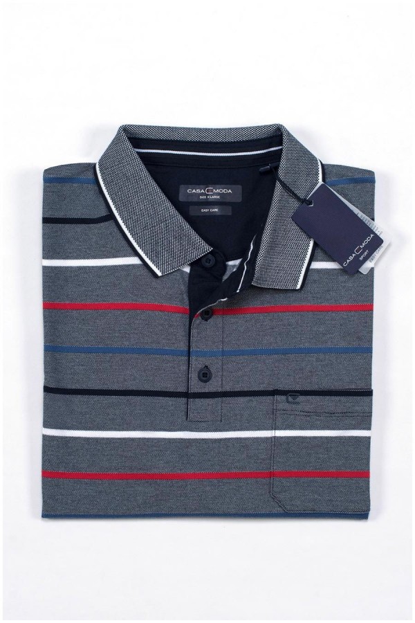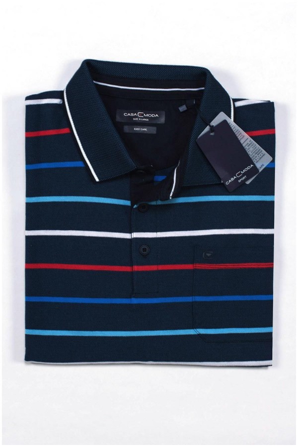 Gestreepte korte mouw polo van het merk Casamoda. Dit poloshirt is gemaakt van 100% katoen in piquékwaliteit en heeft 3 knoopjes aan de knopenlijst. De kraag is afgewerkt met een bedrukte band. De de linkerborst is voorzien van een borstzakje met merklogo erop geborduurd.