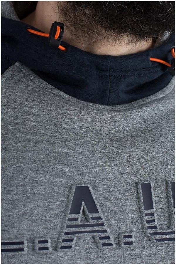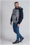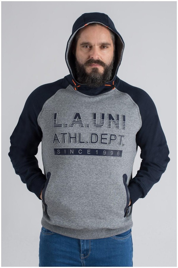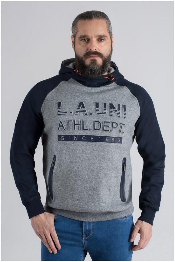 Tweekleurige katoenen sweater met capuchon van het merk Kitaro, met mouwen en capuchon in contrastkleur. De grote maten hoodie heeft een grote opgelegde letterprint op de borst en zakken op de buik die met een blinde rits dicht kunnen. De capuchon is voorzien van een elastiek trekkoord in fluorescerende kleur. De koordstoppers aan beide uiteinden maken het gemakkelijk de capuchon aan te trekken en vast te zetten.