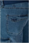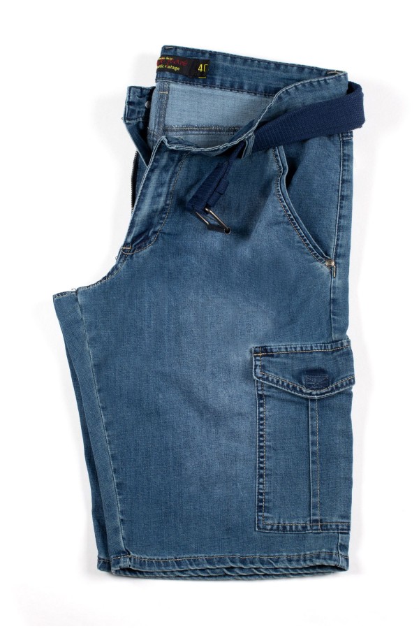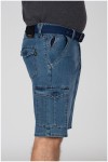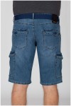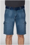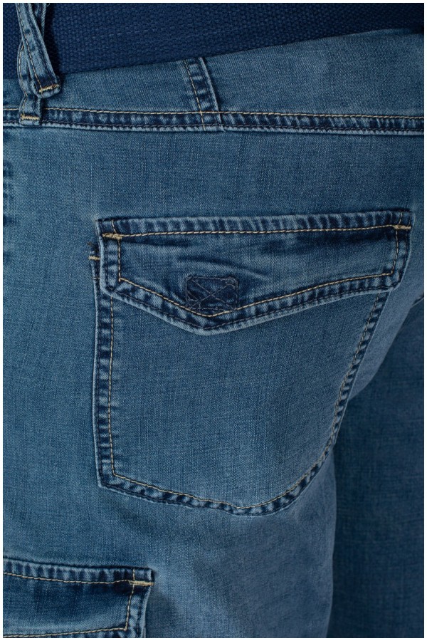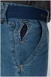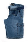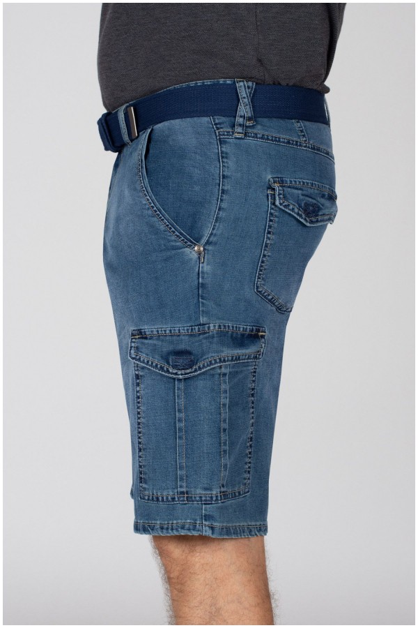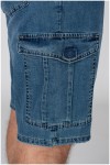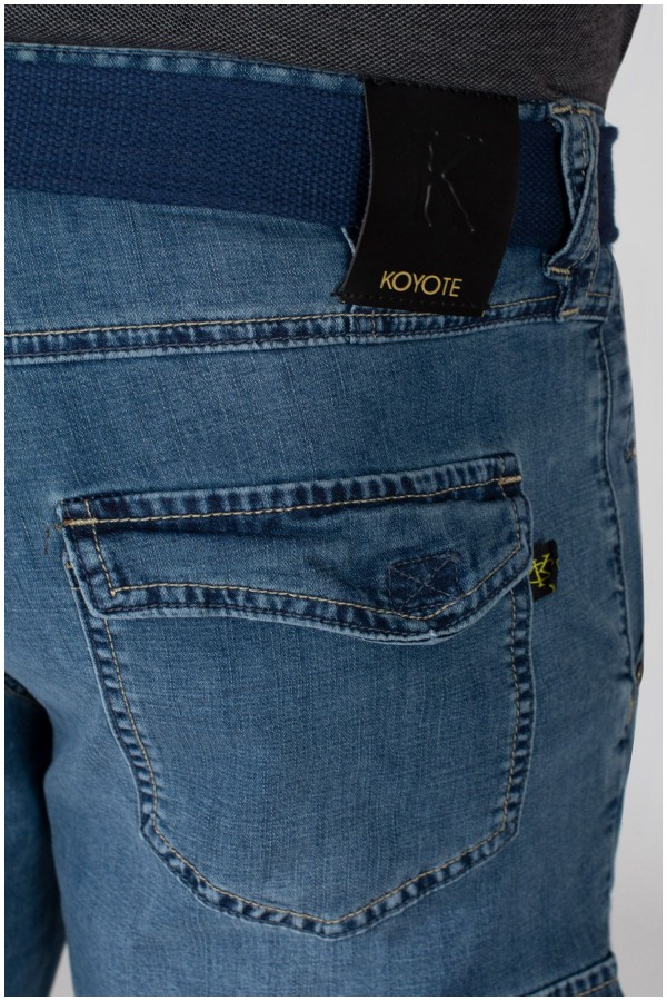 Elastische cargobermuda van het merk Koyote. Deze katoenen jeansbermuda heeft grote zakken aan de voorkant, zijkant en achterkant. De zakken aan de voorkant zijn steekzakken met aan de rechterkant een extra, verticaal, zakje. De cargozakken op de pijpen en aan de achterkant zijn voorzien van een klep met klittenband. Aan de achterkant zit een kleine merklabel. Deze korte broek wordt geleverd met bijpassende riem.