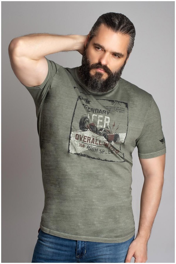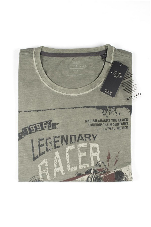 Washed-look korte mouw t-shirt gemaakt van 100% katoen. Dit t-shirt van Kitaro (191137) heeft een borstprint in het thema "racer" met een grote raceauto erop. Ook op de linker mouw bevindt zich een klein printje. Dit t-shirt heeft in de productie een proces ondergaan voor een vintage look, daardoor kan het, ook na diverse wasbeurten, enigszins van kleur vervagen (fade-out).