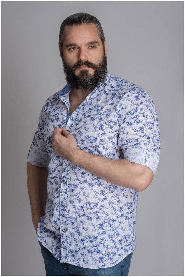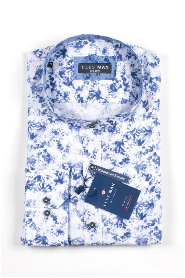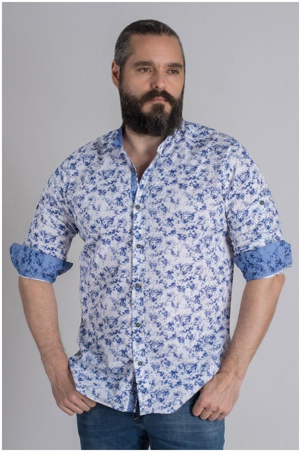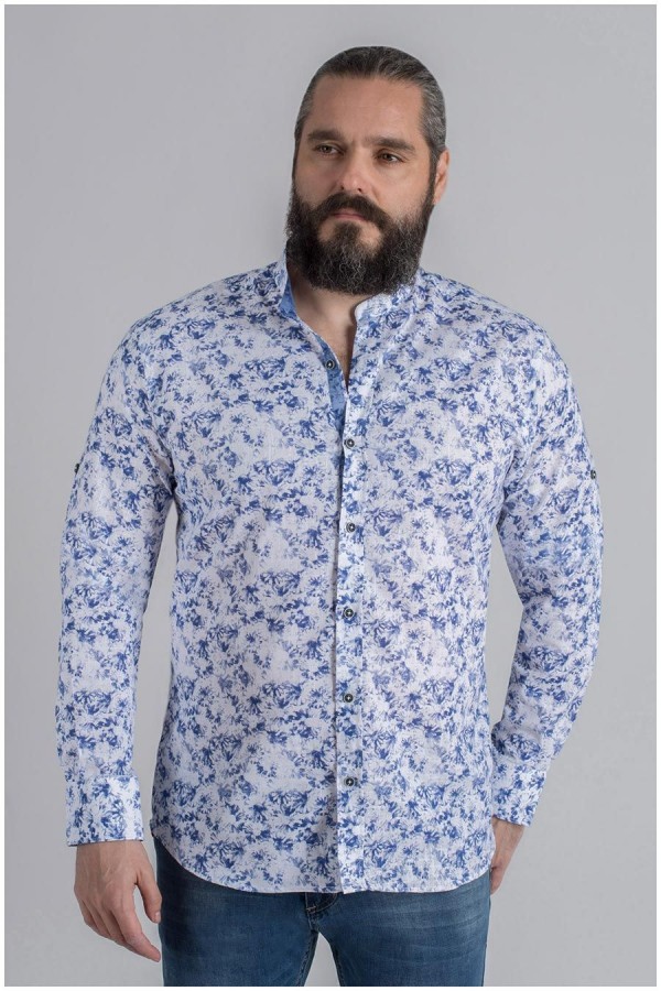Plusman overhemd met lange mouw en trendy mao-kraag. Dit 100% katoenen shirt heeft is bedrukt met een eenkleurige bloemenprint met een stoer 'vervaagd' effect. De mouwen kunnen worden opgerold en door middel van een lusje en knoopje eenvoudig worden vastgezet. Het hemd is afgewerkt met een contraststof langs de knopenlijst en aan de binnenkant van het kraagje en de manchetten.
