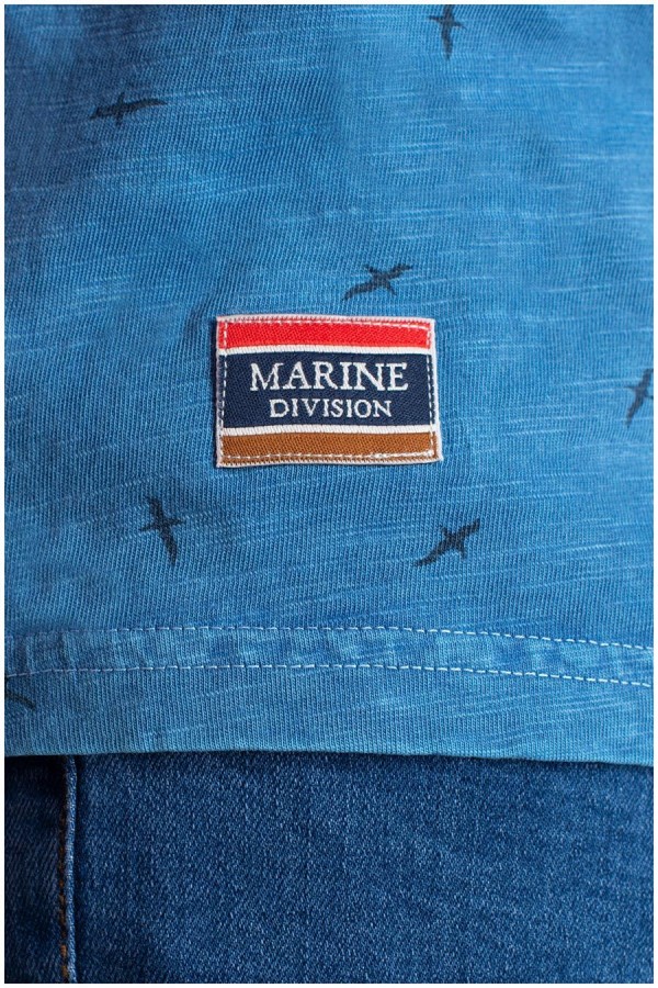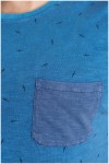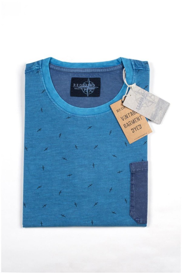 Redfield korte mouw t-shirt (art. RF11913013) met ronde hals en opgestikt borstzakje in contraststof. Dit shirt, met slubeffect in de stof, is gemaakt van 100% katoen en heeft een allover print met vogeltjes. Aan de zijkant bevindt zich een meerkleurige badge.