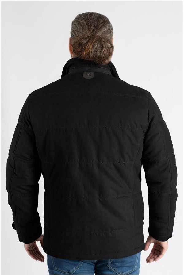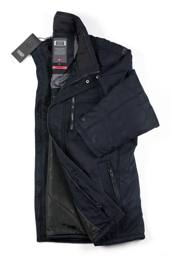 Functionele winterjas met diverse zakken van het merk Canson. Deze grote maten jas is uitgevoerd met veel praktische details, zoals windstoppers op de manchetten, die middels lus en drukknoop kunnen worden versteld voor nog betere afsluiting van de mouwen, en binnenzak met knoop. De sluiting van de jas is winddicht, dankzij de combinatie van een rits en 4 grote drukknopen. Verder heeft de jas een opstaande kraag.