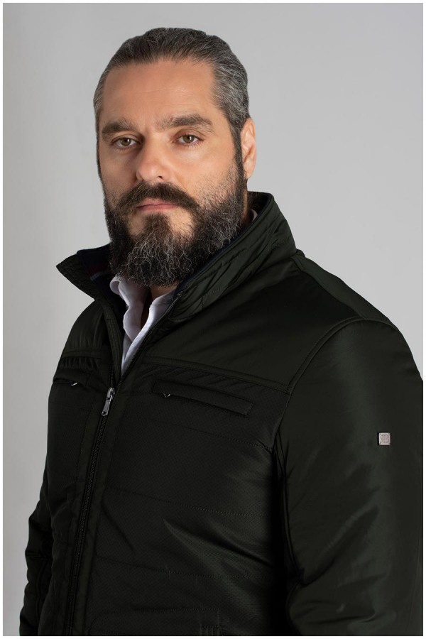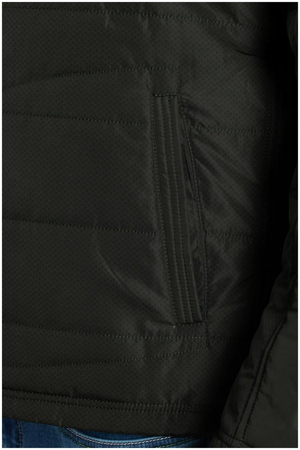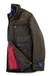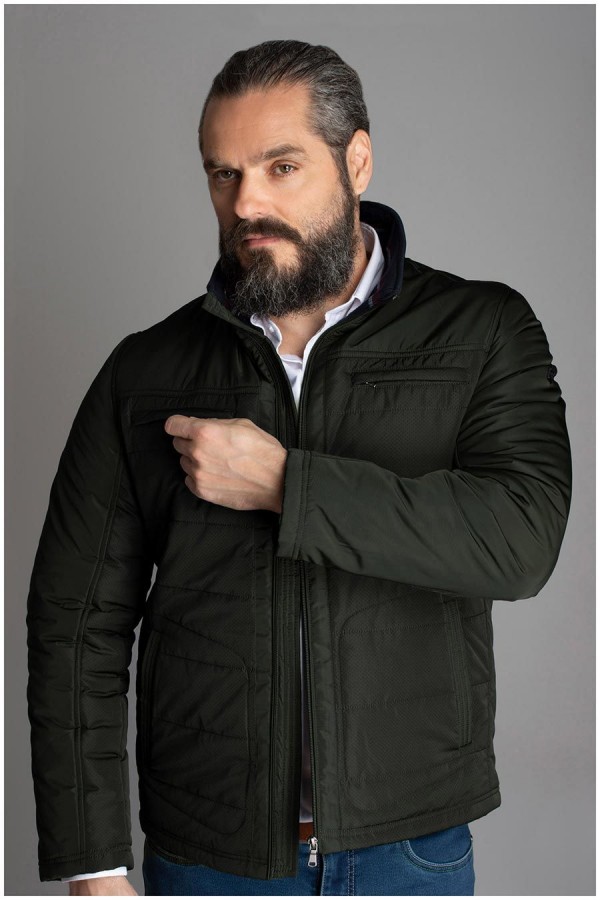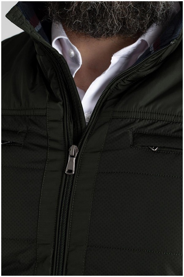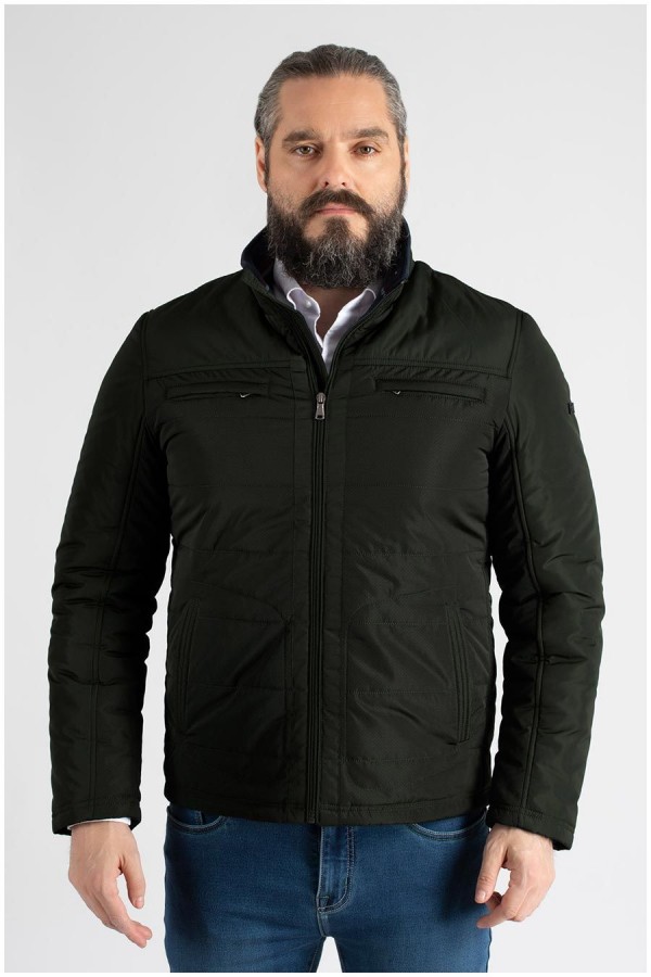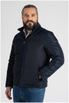 Winterjas van het merk Plusman met rits en opstaande kraag. Deze jas is gemaakt van microvezel met een heel klein subtiel stippeltjespatroon in de stof. Het jack is voorzien van twee steekzakken voor en op de borst aan beide kanten een ritszak. De voering heeft een contrastkleur en de kraag is afgewerkt met een gestreepte stof aan de binnenkant.
