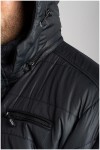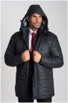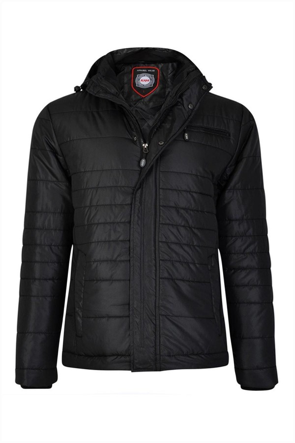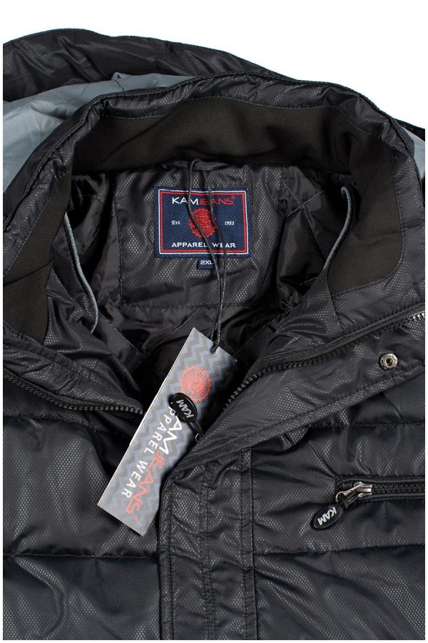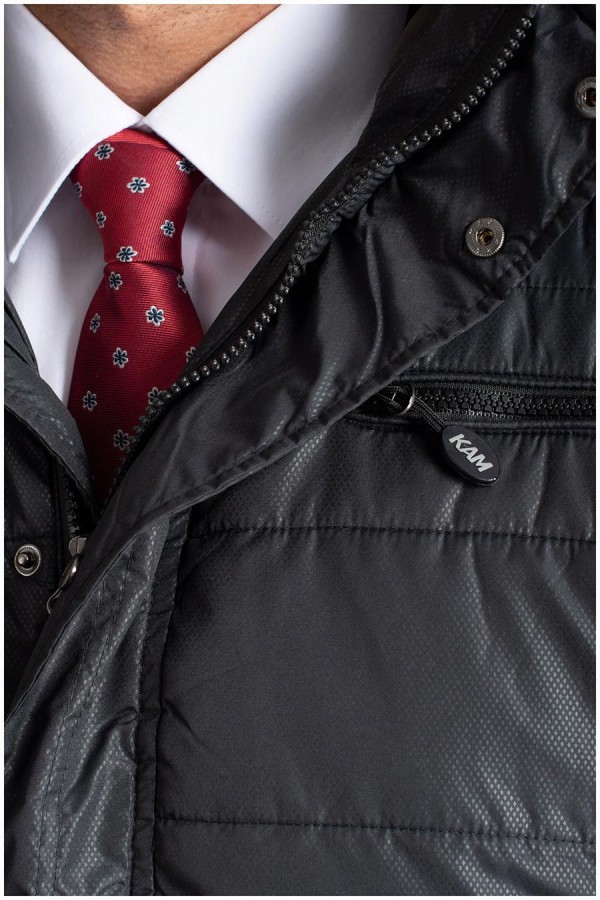 Doorgestikte gevoerde winterjas met extra lange mouwen van het merk KAM Jeanswear (art. nr. KXL KV94). De jas heeft een afneembare capuchon die is gevoerd met contrastkleurige stof en kan worden aangetrokken door middel van een koord. Verder is deze extra lange jas voorzien van een dubbele sluiting met rits en drukknopen, twee steekzakken voorop, een ritszak op de borst en twee binnenzakken. Deze jas is ook beschikbaar in reguliere lengte.