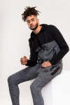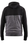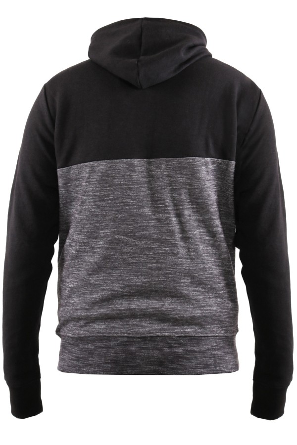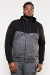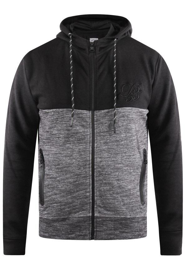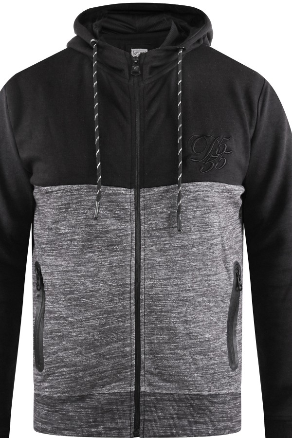 Sweatvest met capuchon en ritssluiting van het merk D555 (Finnley, 620802). Deze grote maten hoodie is tweekleurig zwart, het buikgedeelte in een melange met grijs en het borstgedeelte en de mouwen in zwart. Op de borst zit een ton-sur-ton D555 borduursel en daarnaast heeft het vest 2 ritszakken. De capuchon is te verstellen met koordjes.