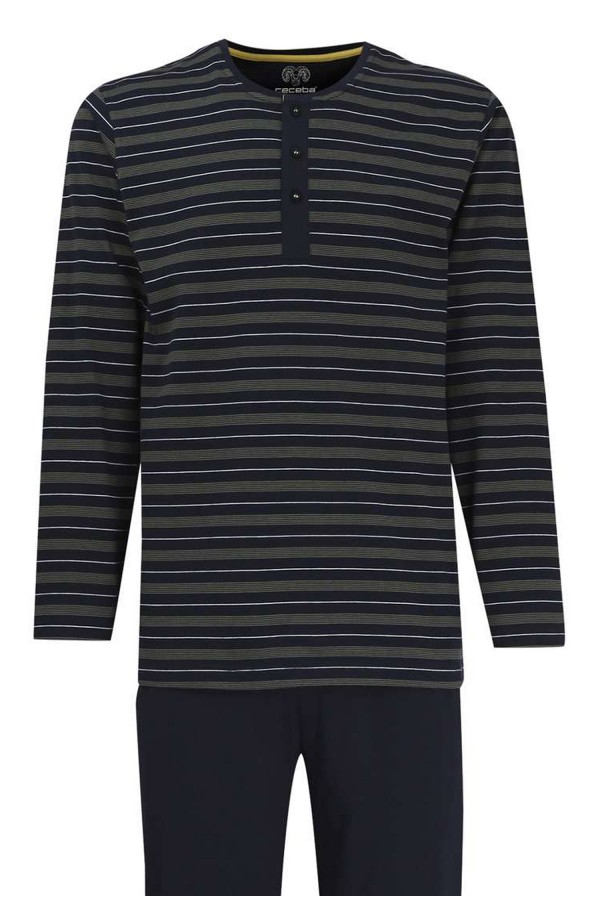 Pyjama set van het merk Ceceba bestaande uit een pyjama shirt met lange mouwen en een lange pyjamabroek. Het grote pyjama-shirt heeft een gestreept patroon en een Serafino-sluiting met drie knopen. Aan de binnenkant van de ronde hals zit een contrasterende band. De lange broek van de grote maten pyjama's zijn in één kleur.