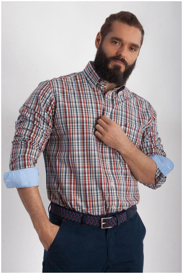Ruiten casual shirt van Casamoda met extra mouwlengte (lengte van de mouw ca 72cm). Dit 100% katoenen overhemd heeft één borstzakje en is afgewerkt met tonale contrasten aan de binnenkant van de button down kraag en van de manchet. De manchet is door middel van een dubbele knoop verstelbaar.