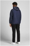 Gewatteerd jack uit de plus size collectie van het denim-merk Jack & Jones. De grote maten winterjas heeft een hoge kraag met capuchon en heeft ook twee ritszakken. De verborgen rits is afgewerkt met contraststiksels. Links op de borst is het jack voorzien van een klein merklogo.
