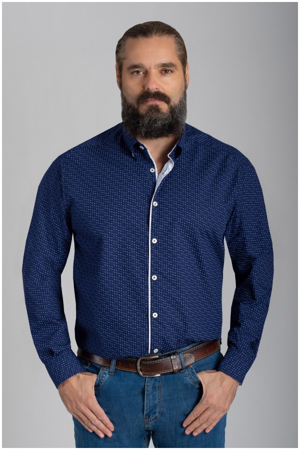 Lange mouw vrijetijdsoverhemd van het merk Plusman. Dit grote maten overhemd heeft een alloverprint van kleine geometrische figuurtjes. Als modieus detail is het shirt afgewerkt met een contraststof in de kraag, aan de knopenlijst en aan de omslag van de manchetten.
