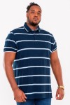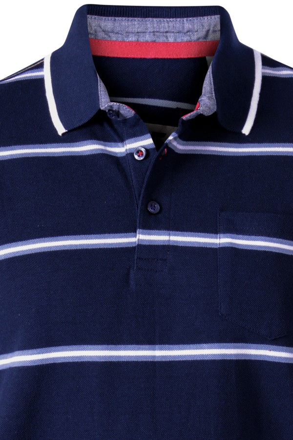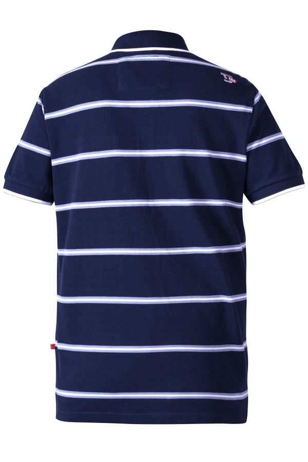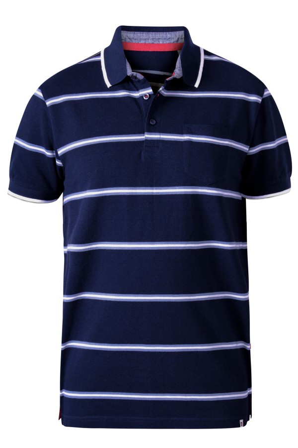 Korte mouw polo met gestreept dessin van het merk D555 (Montego 160913). De grote maten polo is gemaakt van 100% biologisch katoen in een zachte piquékwaliteit, een milieubewuste keuze dus! Het poloshirt is voorzien van een opgestikt borstzakje en heeft verschillende sportieve details zoals de chambray contraststof en gekleurde band in de kraag en een geborduurd logo op de schouder. Door de splitjes in de zijnaad draagt de xxl polo extra comfortabel.