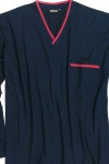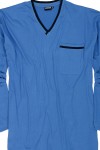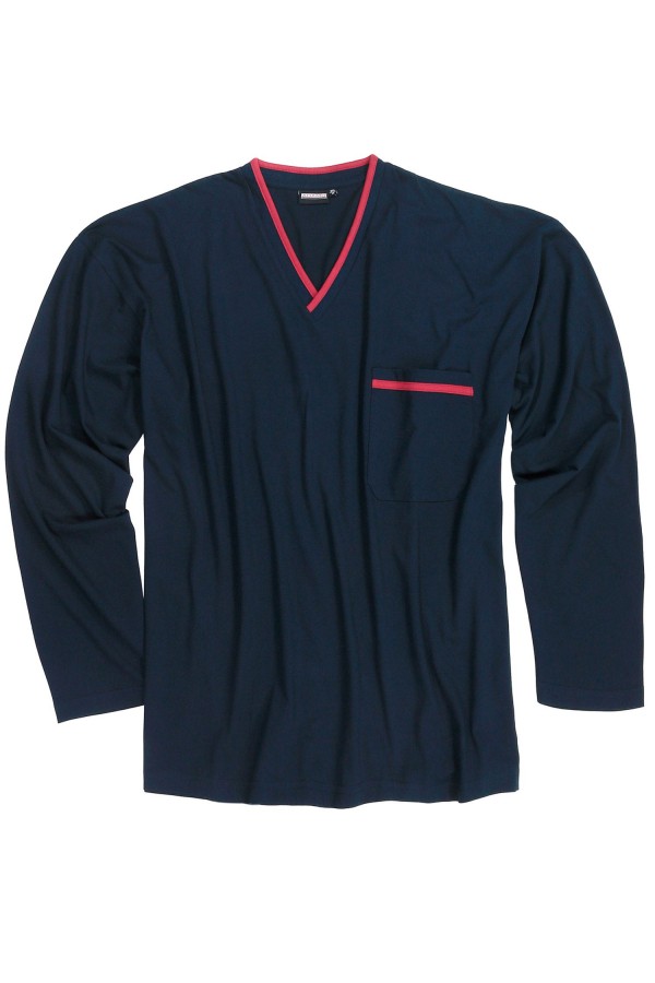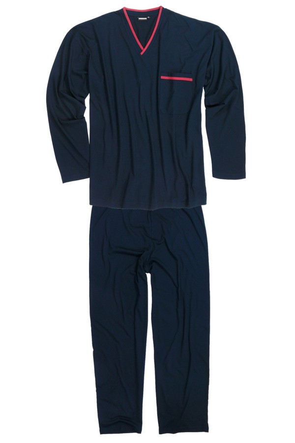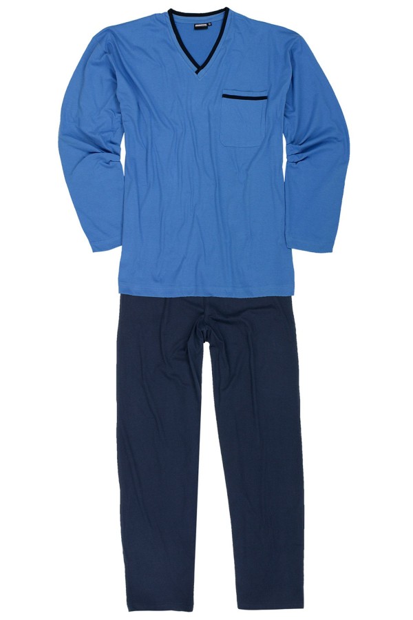Uni lange pyjama van Adamo (Art.nr. Beppo). De grote maten pyjama bestaat uit een uni pyjamahemd met v-hals en een borstzakje en een uni pyjamabroek met elastische band en een achterzakje. De pyjamajas heeft contrastbanden langs de kraag en aan de het borstzakje. De XXL pyjamaset is gemaakt van 100% katoen in een fijne, zachte en huidvriendelijke jerseykwaliteit. De pyjama kan worden gewassen op 60 graden in de wasmachine.