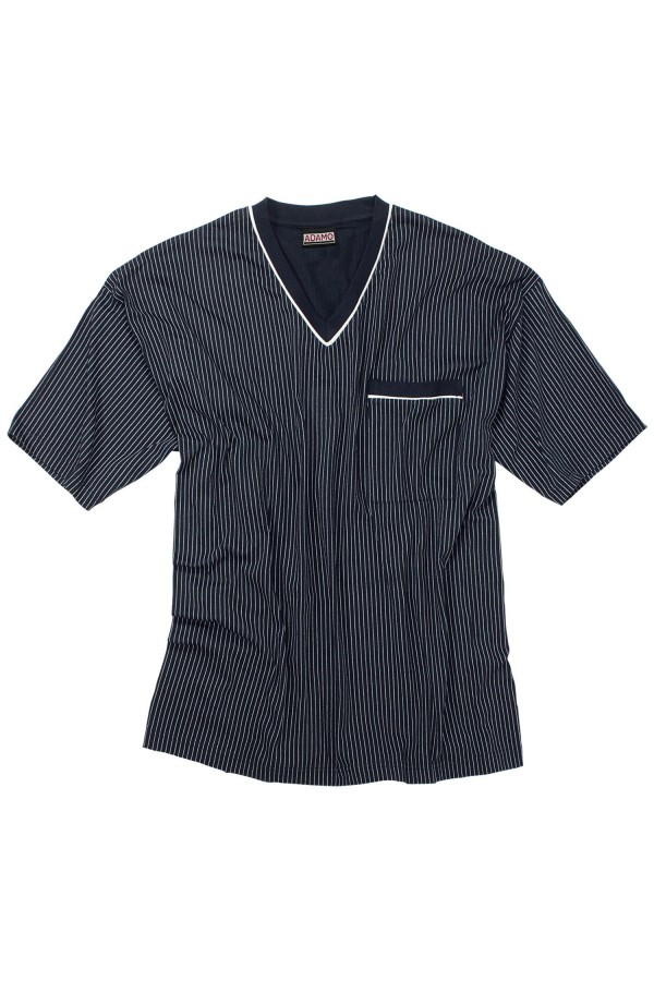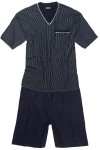 Korte pyjama van het merk Adamo. De plussize shortama (art. nr. Gustav 119251) is gemaakt van 100% katoen in een single jersey kwaliteit. De pyjamaset bestaat uit een gestreept pyjamahemd met korte mouwen en een v-hals en een uni korte broek. De broek is voorzien van een achterzakje. De huidvriendelijke grote maten shorty is verkrijgbaar in twee kleuren.