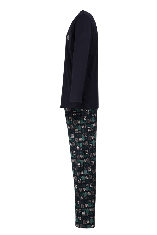 Lange pyjama uit de collectie van het merk Ceceba. De grote maten pyjama is volledig duurzaam geproduceerd en is gemaakt van 100% organisch katoen in een zachte single jersey kwaliteit. De pyjamaset bestaat uit een effen pyjamahemd met lange mouwen, een v-hals en een badge op de linker borst. De plus size lange pyjamabroek is bedrukt met een allover print.