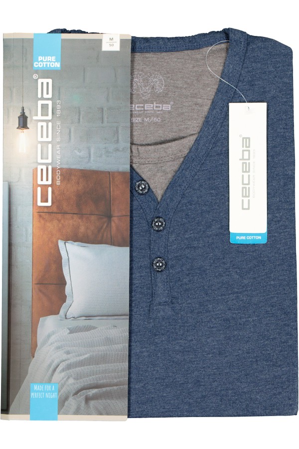 Shortamaset van het merk Ceceba bestaande uit een korte broek en een korte mouwen shirt met v-hals, die elk een andere kleur hebben. Als modieus detail heeft het pyjamahemd een decoratieve, niet functionele knoopsluiting en zijn de mouwen voorzien van een contraststof in de kleur van de broek aan de uiteinden. Ook heeft het shirt een merkprint in de kraag en aan de zijkant. De pyjama-short is volledig uni en heeft een elastische tailleband. De grote maten pyjama is gemaakt van 100% katoen in een single jersey kwaliteit die zacht en rekbaar is en daardoor heerlijk draagt. Een grote maten shortama dus met een jonge en sportieve uitstraling!