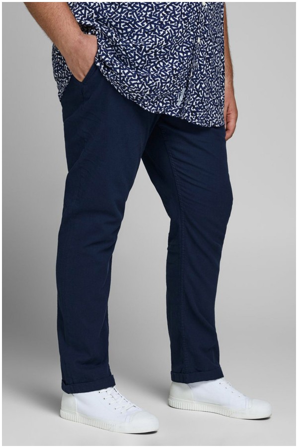 Elastische chino van het merk Jack & Jones gemaakt van een mix van viscose en linnen, aangevuld met elastaan. Daardoor draagt deze casual broek met stretch uit de Plus Size Collection van Jack & Jones heerlijk comfortabel en zacht. Dit chinomodel is een slim fit, waarvan de pasvorm smal is en die nauw om het bovenbeen valt, zonder te strak te voelen.